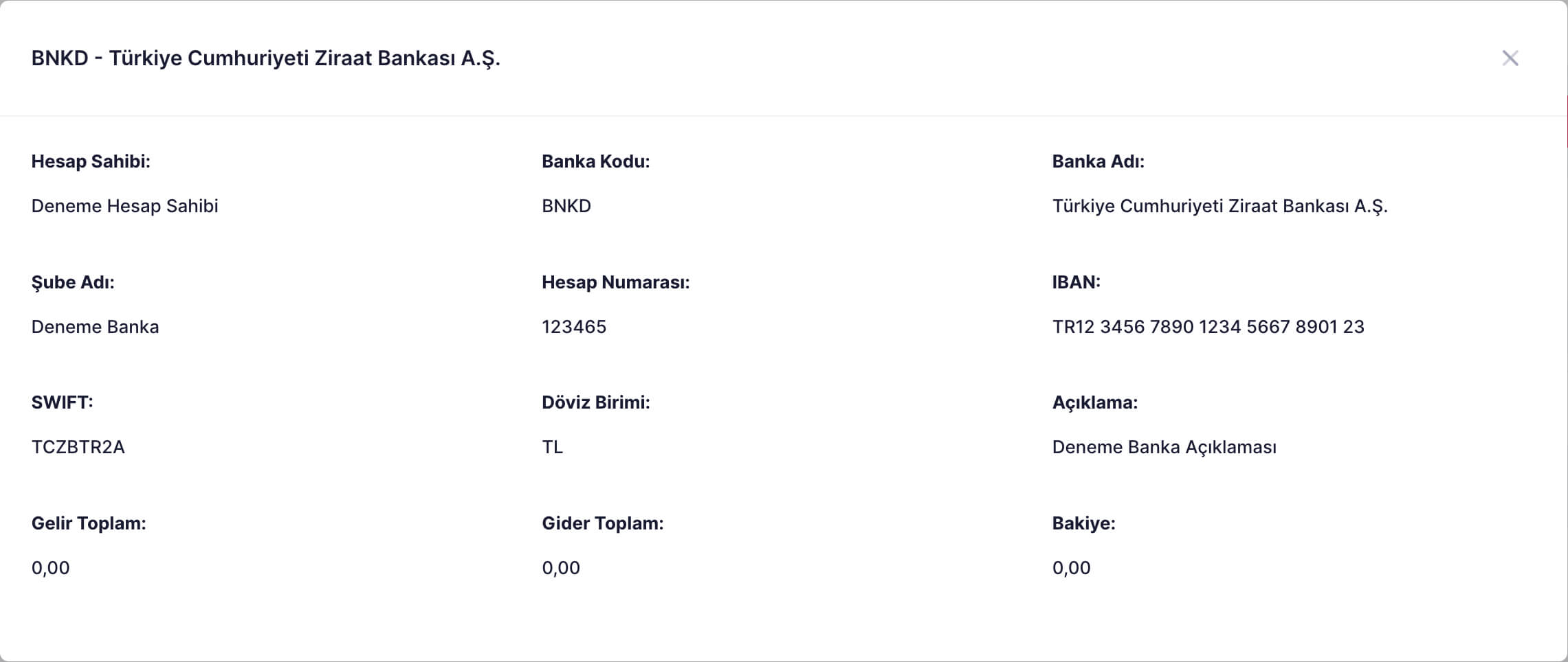 Banka bilgilerini görüntülemek için Menü Çubuğu’nda bulunan Yönetim > Finans > Bankalar’a tıklayın. Tabloda ilgili bankayı bulun. İşlemler sütunu altında bulunan ‘Banka Bilgisi’ne tıklayın.