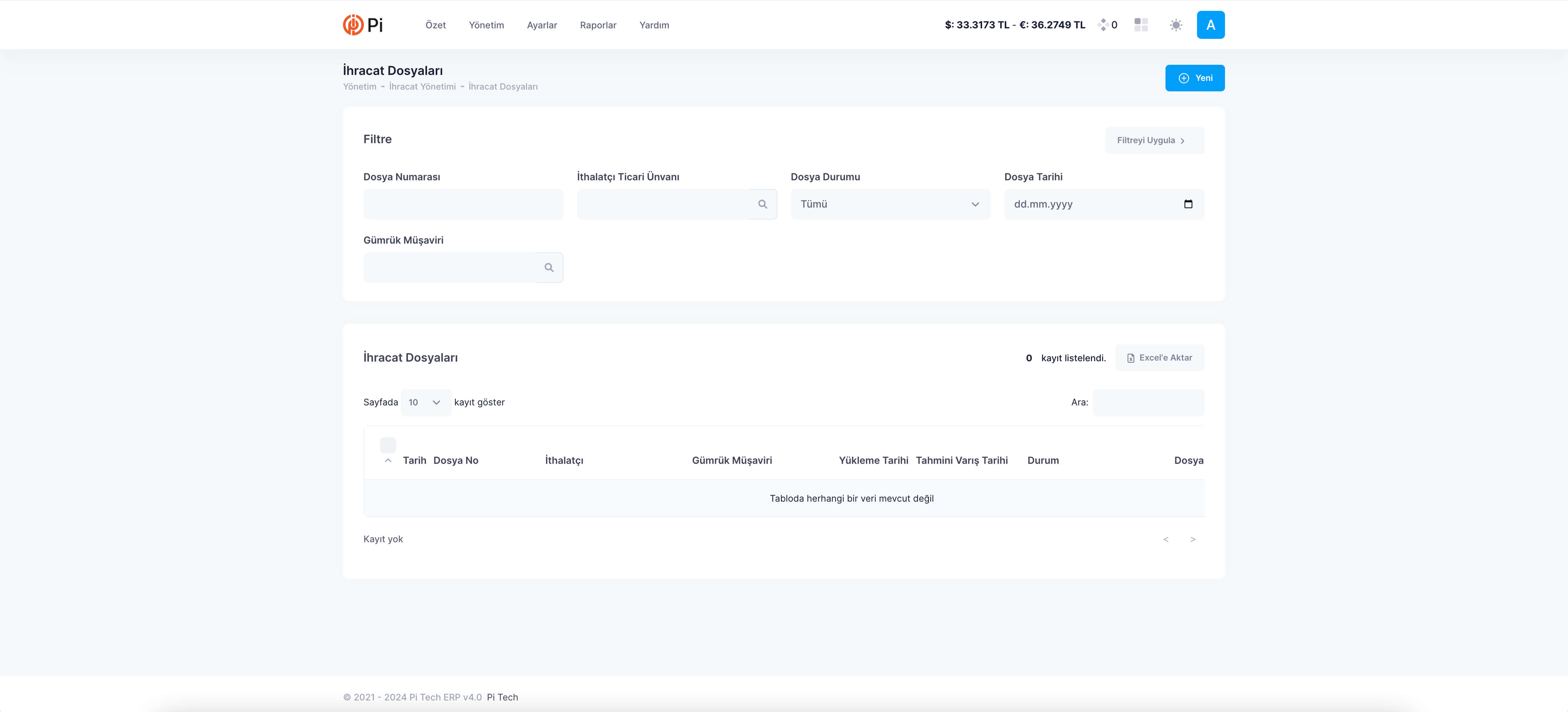 İhracat Dosyaları sayfasında sağ üst tarafta bulunan ‘ Yeni’ butonuna tıklayın.