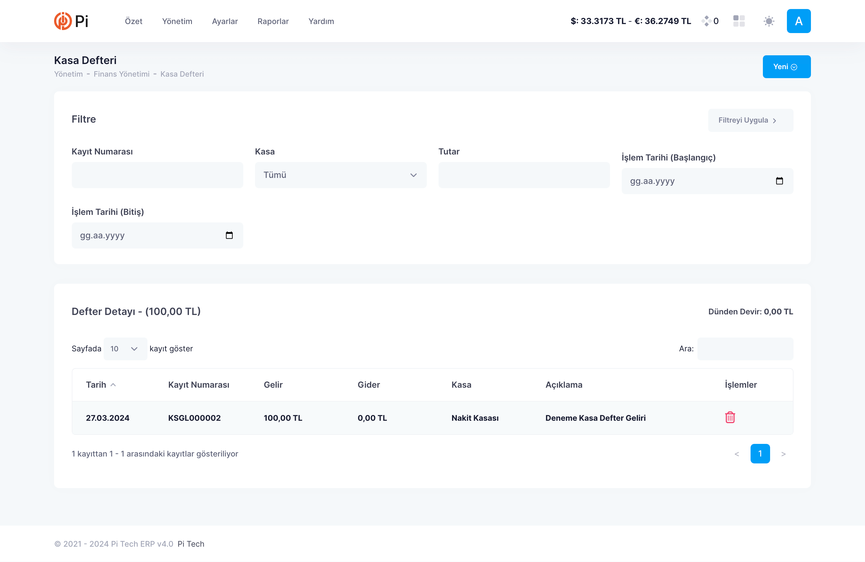 Gelir veya Gider kaydını kasa defterinden silmek için ilgi kaydın satırında bulunan ‘Hareketi Sil’ butonuna tıklayın.