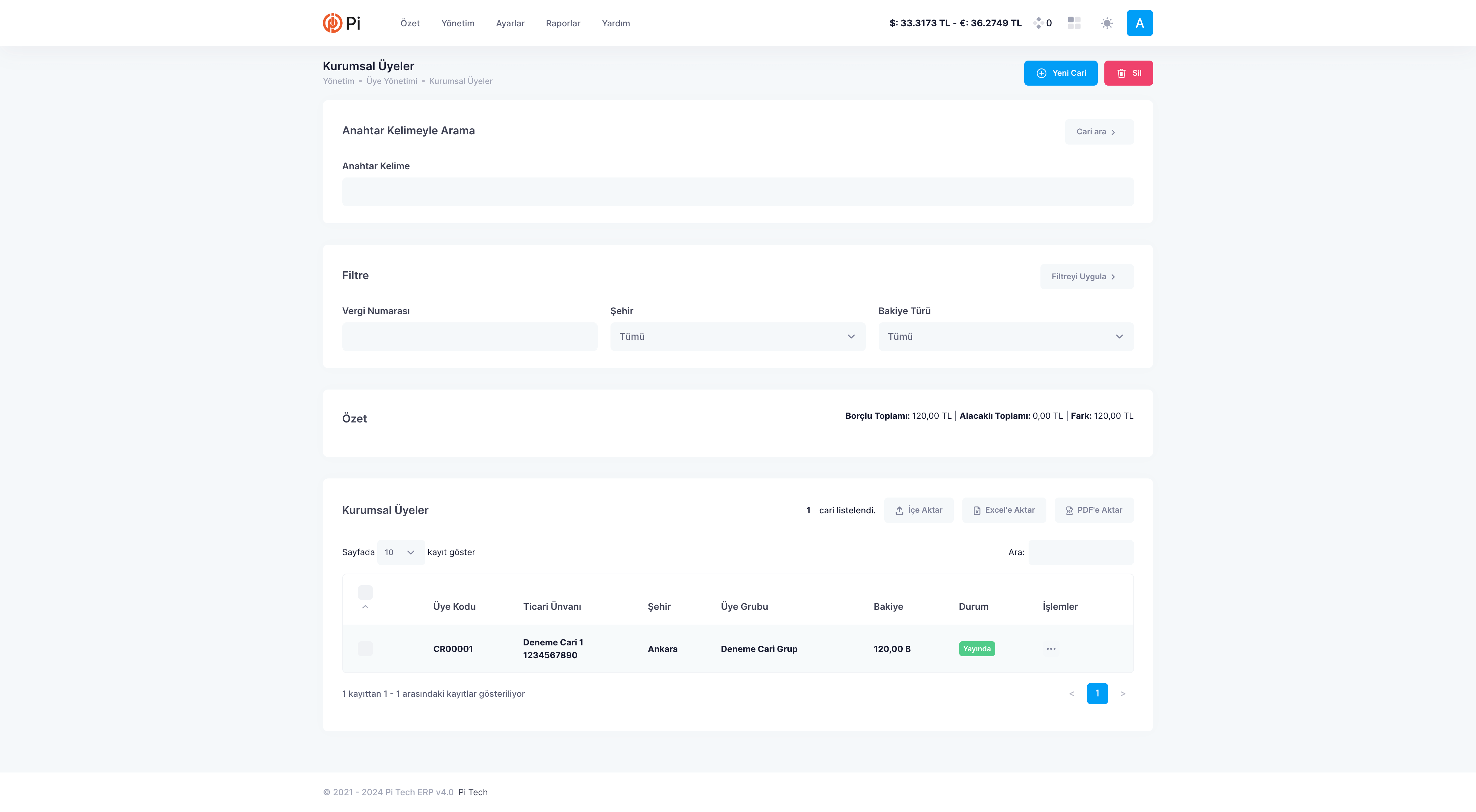 Kurumsal Üyeler sayfasında sağ üst tarafta bulunan ‘Yeni Cari’ butonuna tıklayın.