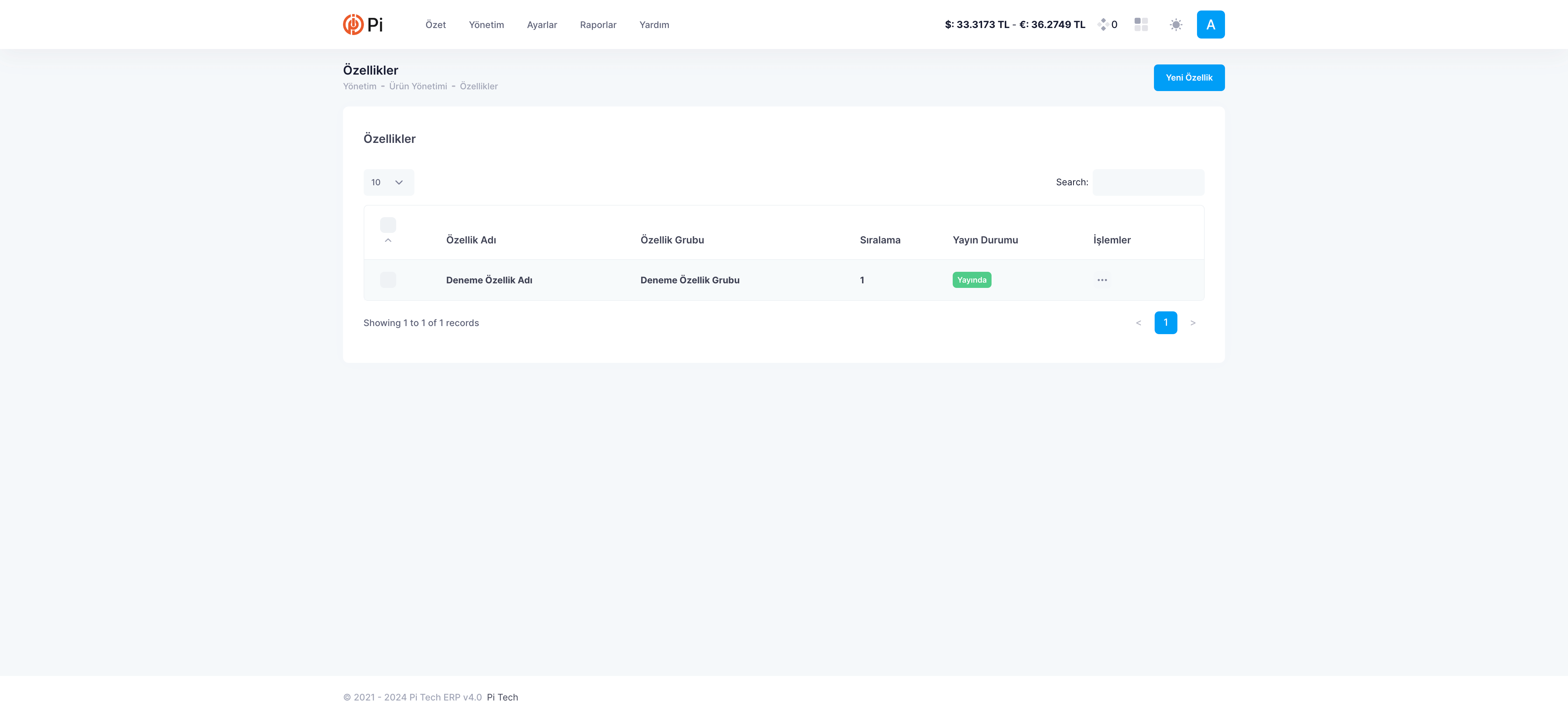 Oluşturulan ürün özelliğini düzenlemek için Menü Çubuğu’nda bulunan Yönetim > Ürün > Özellikler’e tıklayın. Tabloda ilgili özelliğe bulun. İşlemler sütunu altında bulunan üç noktaya tıklayın. Açılan işlemler menüsünden ‘Düzenle’ye tıklayın. Aşağıdaki adımları uygulayın: