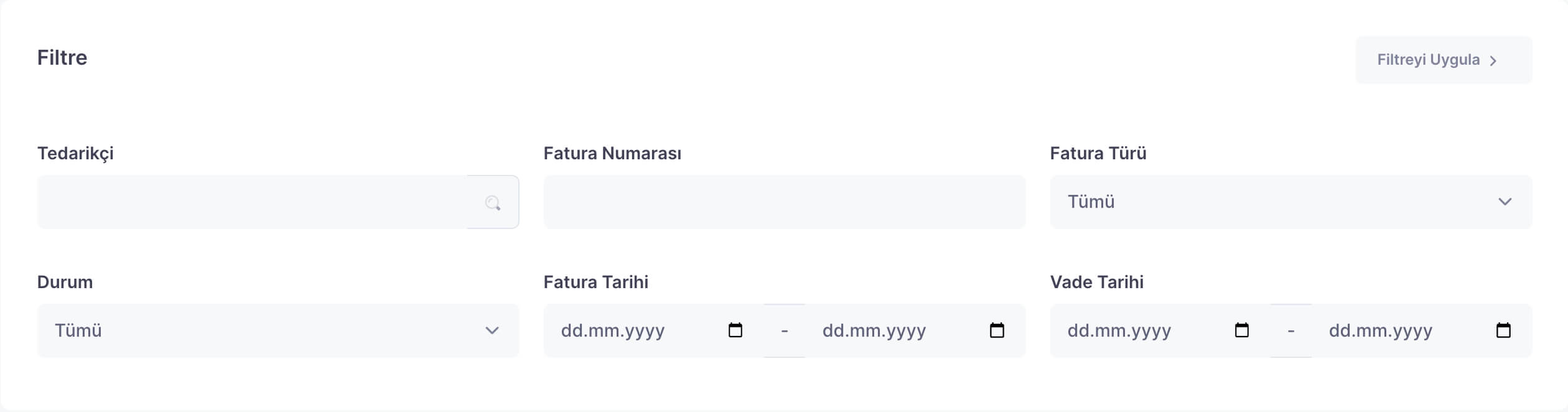 Oluşturalan faturalar arasından ilgili kaydı bulmak veya belirli kriterlere göre faturaları filtrelemek için ‘Filtre’ alanını kullanın. Kriterleri belirledikten sonra alanın sağ üst tarafından bulunan ‘Filtreyi Uygula’ya tıklayın.