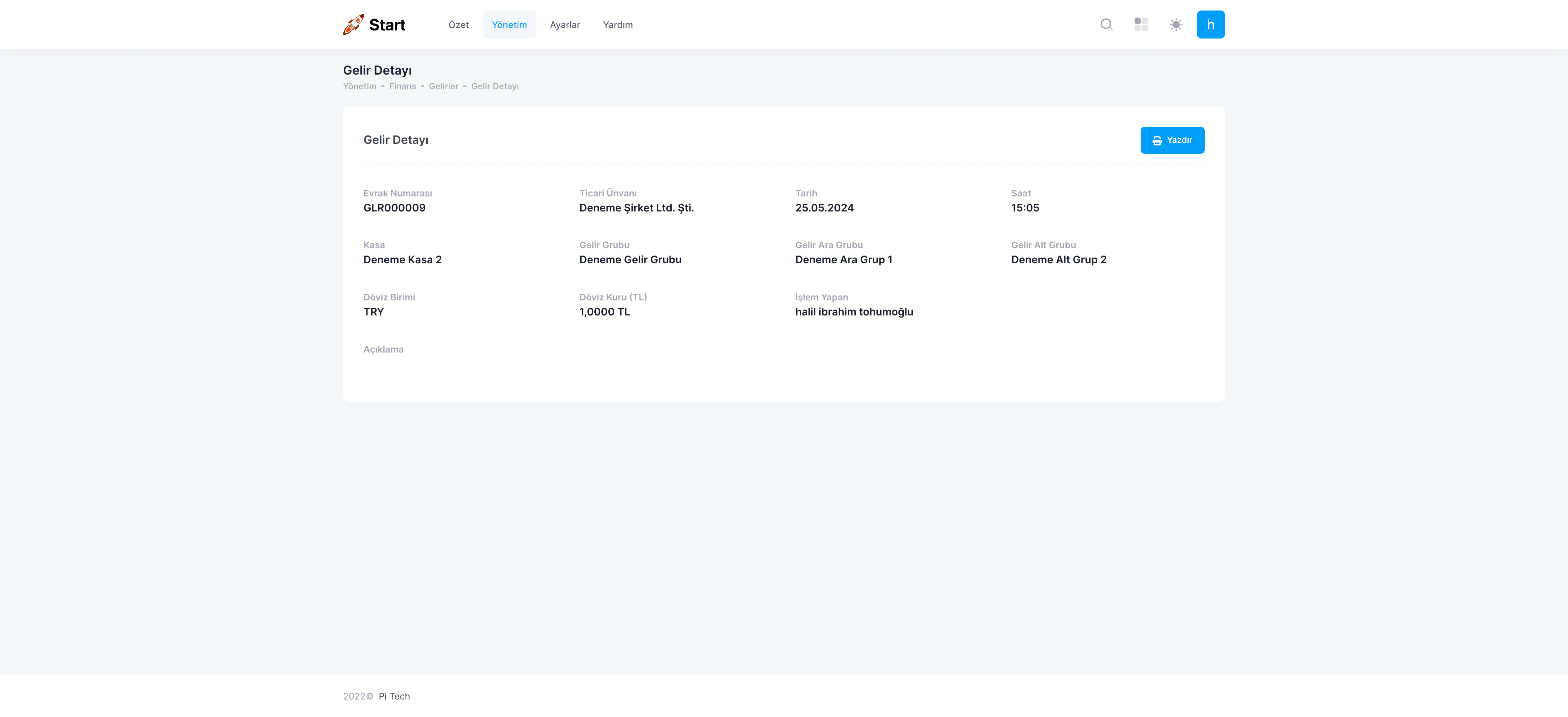 Gelire ait detay bilgileri görüntülemek için Menü Çubuğu’nda bulunan Yönetim > Finans > Gelirler’e tıklayın. Tabloda ilgili geliri bulun. İşlemler sütunu altında bulunan üç noktaya tıklayın. Açılan işlemler menüsünden ‘Detay’a tıklayın.