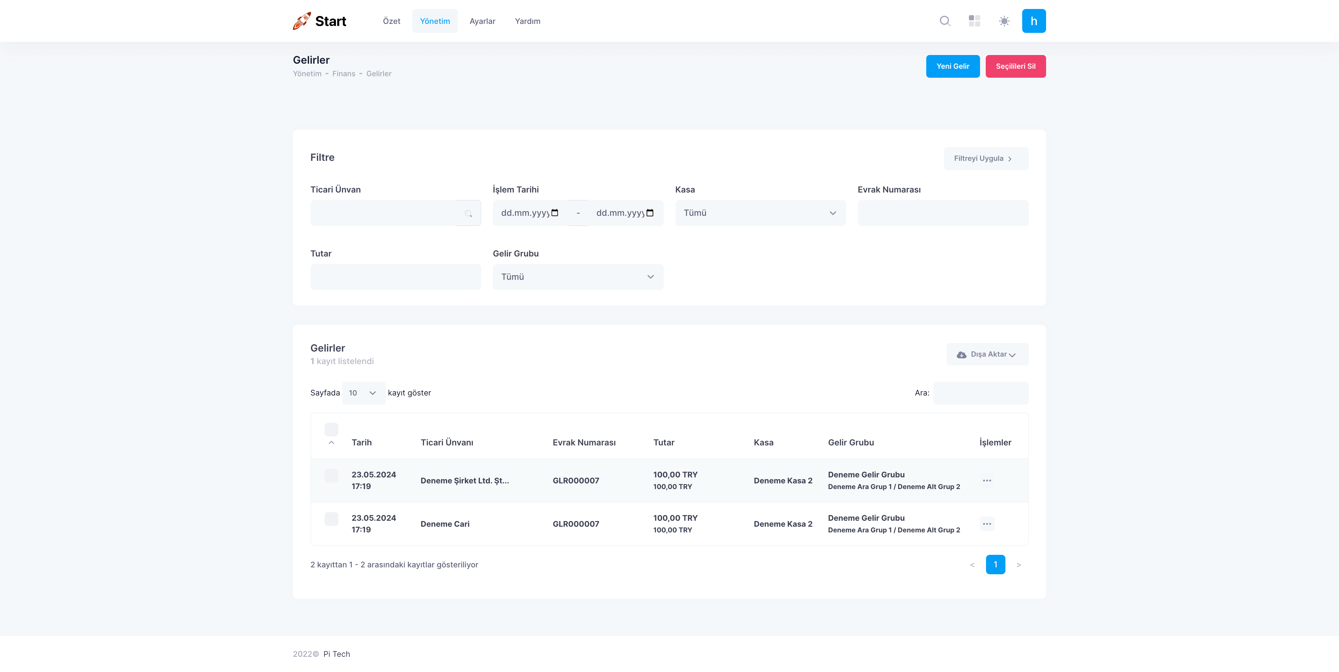 Kayıt edilen geliri silmek için Menü Çubuğu’nda bulunan Yönetim > Finans > Gelirler’e tıklayın. Tabloda ilgili geliri bulun. İşlemler sütunu altında bulunan üç noktaya tıklayın. Açılan işlemler menüsünden ‘Sil’e tıklayın. Gelen uyarıyı onaylayın.
