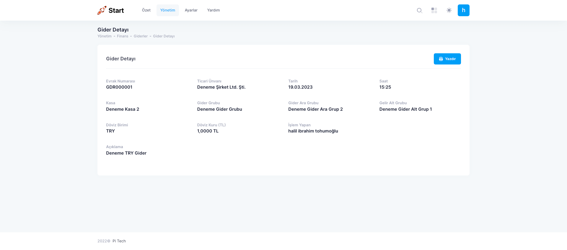 Gidere ait detay bilgileri görüntülemek için Menü Çubuğu’nda bulunan Yönetim > Finans > Giderler’e tıklayın. Tabloda ilgili gideri bulun. İşlemler sütunu altında bulunan üç noktaya tıklayın. Açılan işlemler menüsünden ‘Detay’a tıklayın.