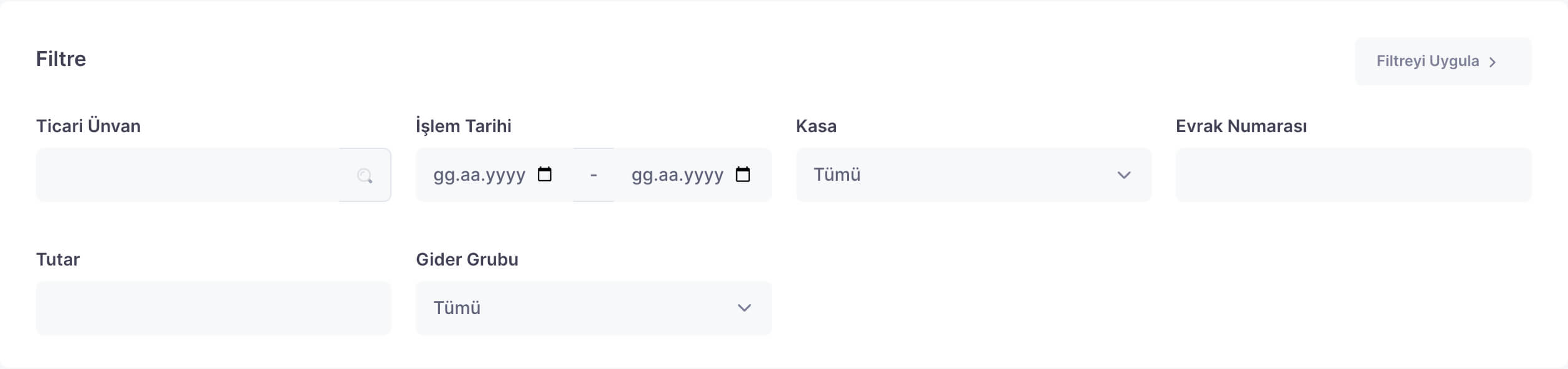 Kayıt edilen giderler arasından ilgili kaydı bulmak veya belirli kriterlere göre gelirleri filtrelemek için ‘Filtre’ alanını kullanın. Kriterleri belirledikten sonra alanın sağ üst tarafından bulunan ‘Filtreyi Uygula’ya tıklayın.