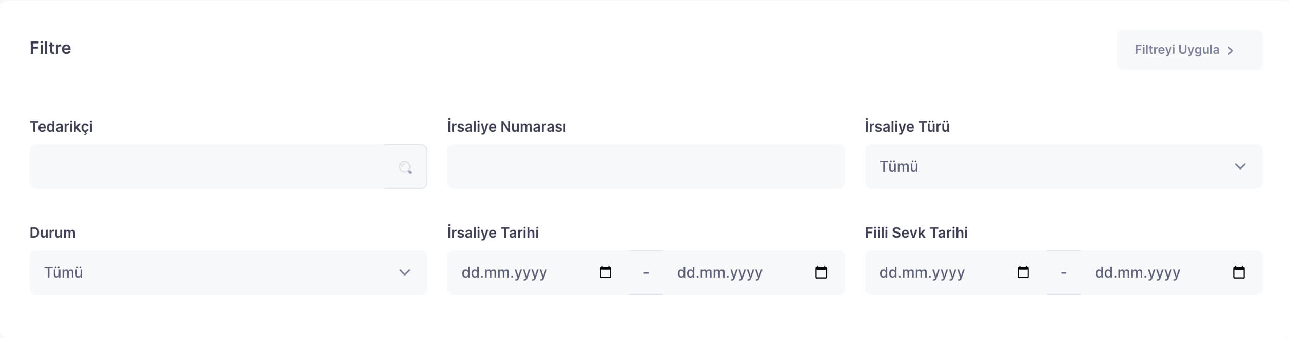 Oluşturalan irsaliyeler arasından ilgili kaydı bulmak veya belirli kriterlere göre irsaliyeleri filtrelemek için ‘Filtre’ alanını kullanın. Kriterleri belirledikten sonra alanın sağ üst tarafından bulunan ‘Filtreyi Uygula’ya tıklayın.