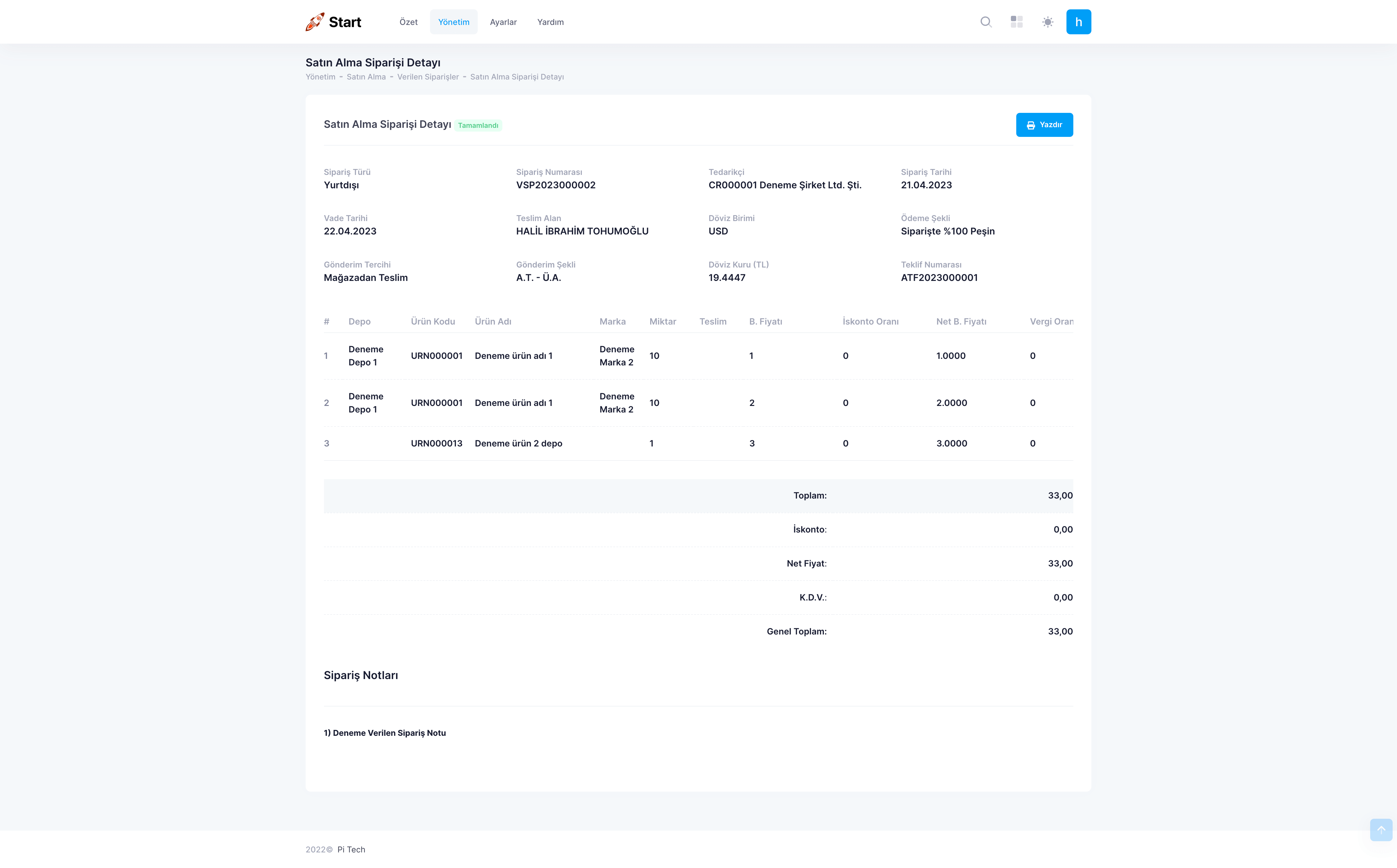 Siparişe ait detay bilgileri görüntülemek için Menü Çubuğu’nda bulunan Yönetim > Satın Alma veya Satış > Siparişler’e tıklayın. Tabloda ilgili siparişi bulun. İşlemler sütunu altında bulunan üç noktaya tıklayın. Açılan işlemler menüsünden ‘Detay’a tıklayın.