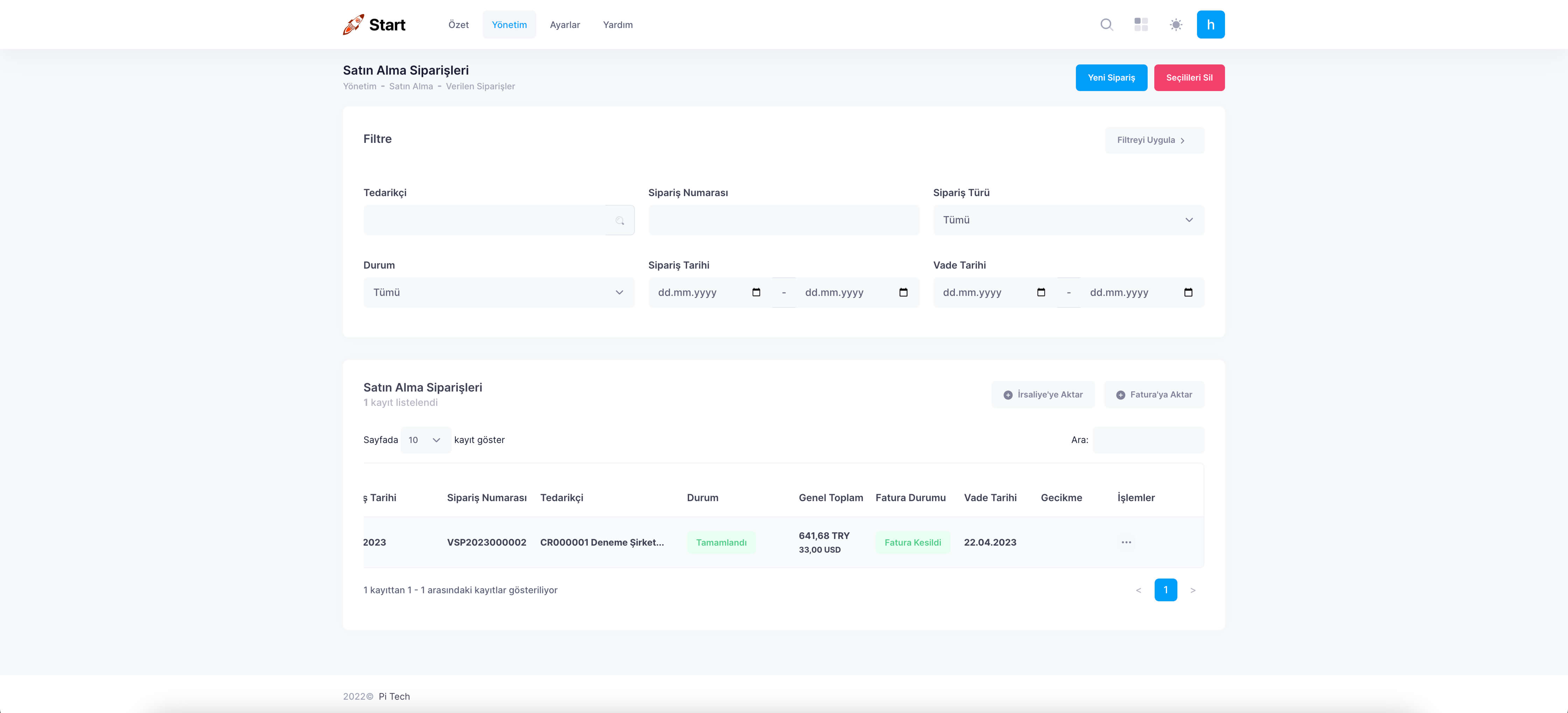 Oluşturalan siparişler arasından ilgili kaydı bulmak veya belirli kriterlere göre siparişleri filtrelemek için ‘Filtre’ alanını kullanın. Kriterleri belirledikten sonra alanın sağ üst tarafından bulunan ‘Filtreyi Uygula’ya tıklayın.