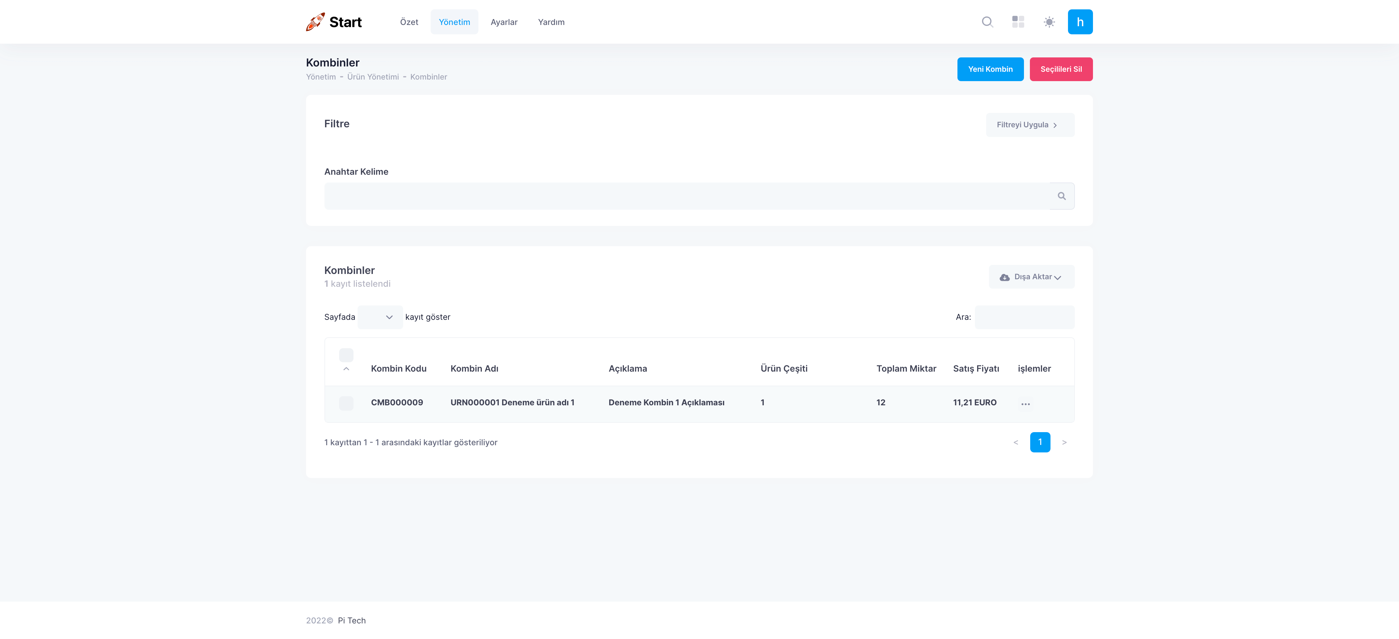 Oluşturulan ürün kombinini silmek için Menü Çubuğu’nda bulunan Yönetim > Ürün >Kombinler’e tıklayın. Tabloda ilgili kombini bulun. İşlemler sütunu altında bulunan üç noktaya tıklayın. Açılan işlemler menüsünden ‘Sil’e tıklayın. Gelen uyarıyı onaylayın.