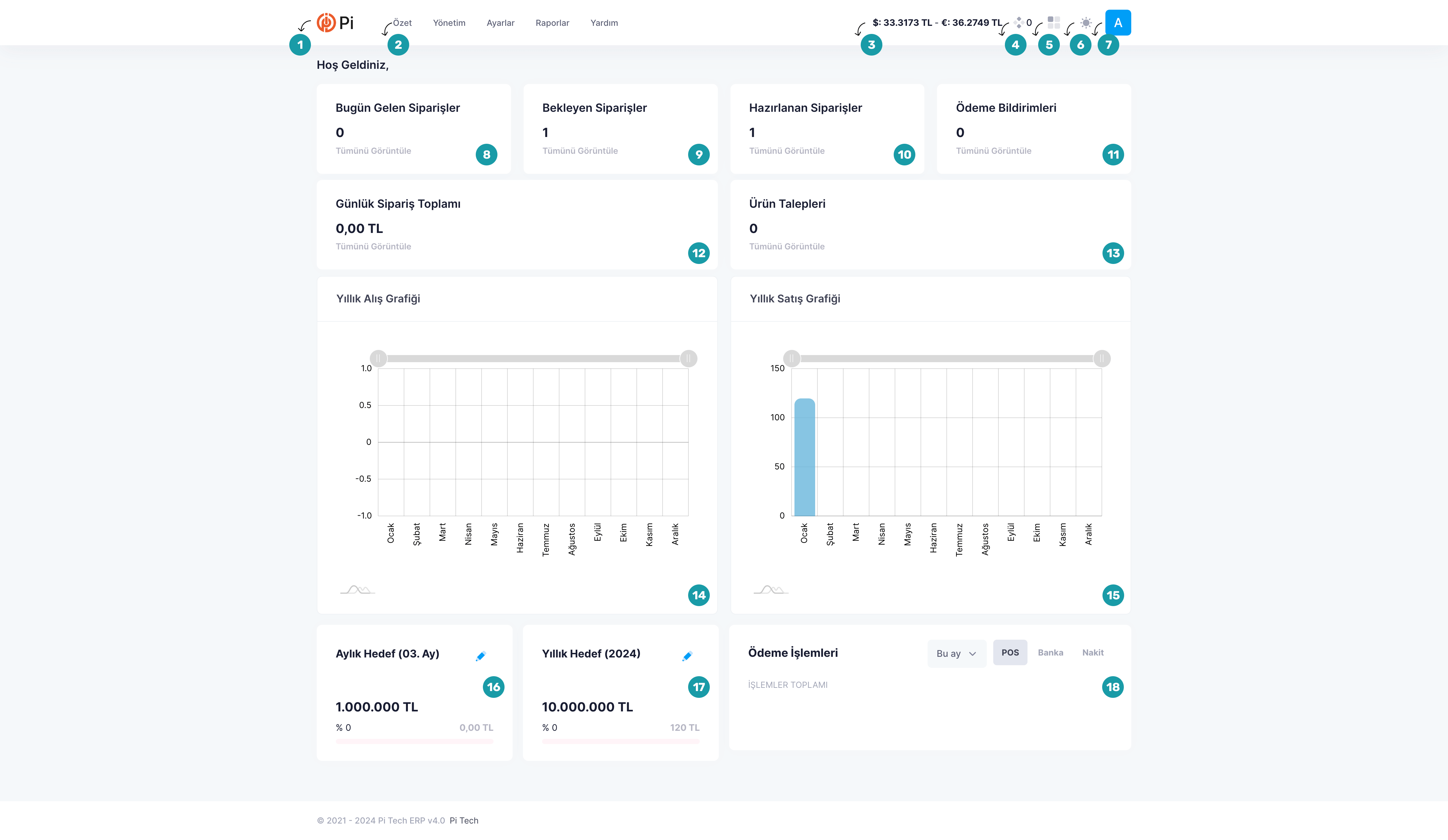 Pi Tech ERP ile gün içinde oluşturulan Yurt İçi ve Yurt Dışı Alınan Siparişlerin toplam sayısı gösterilir. Siparişlerin listesini görüntülemek için ‘Tümünü Görüntüle’ye tıklayın.
