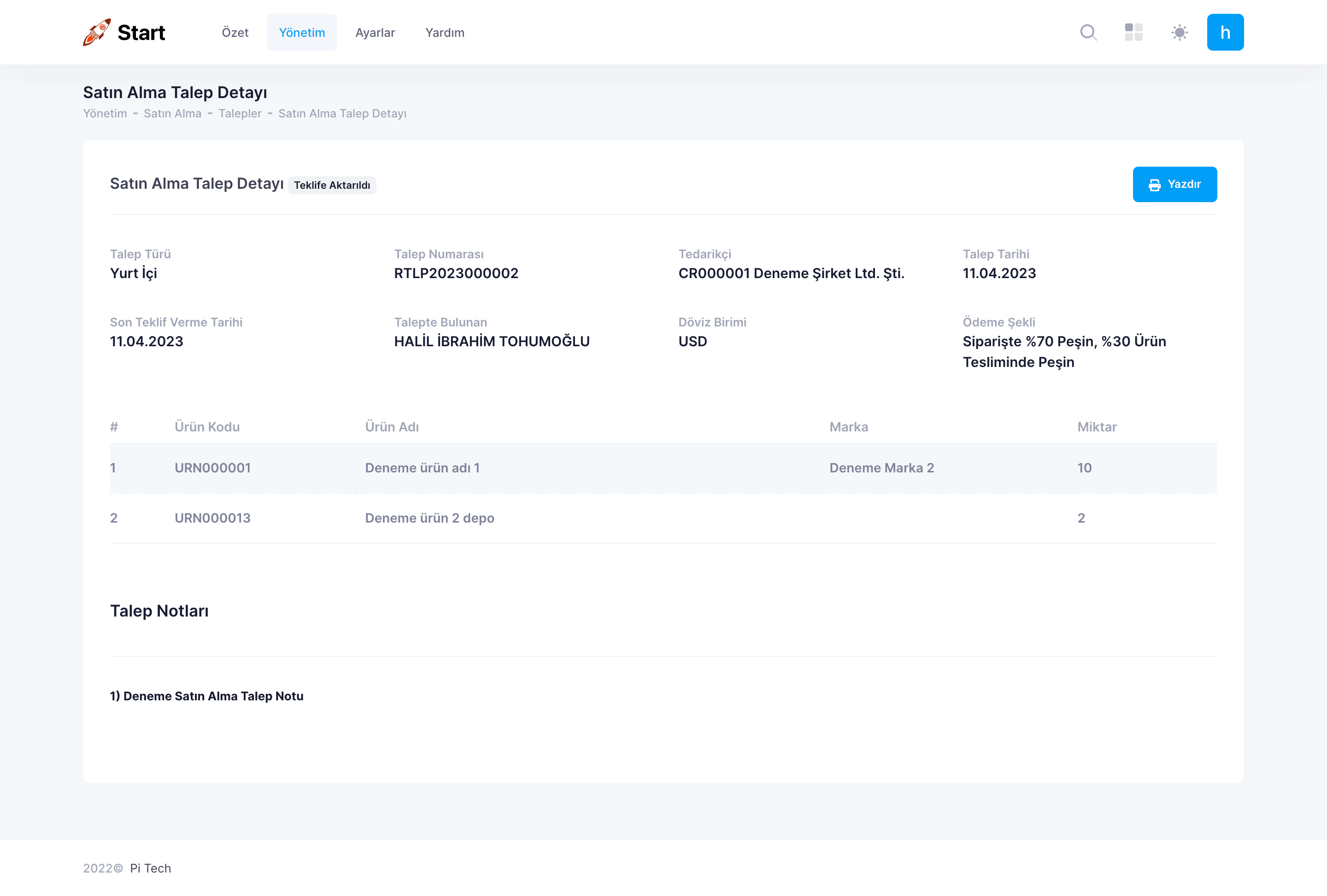 Talebi yazdırmak için Menü Çubuğu’nda bulunan Yönetim > Satın Alma veya Satış > Talepler’e tıklayın. Tabloda ilgili talebi bulun. İşlemler sütunu altında bulunan üç noktaya tıklayın. Açılan işlemler menüsünden ‘Yazdır’a tıklayın.