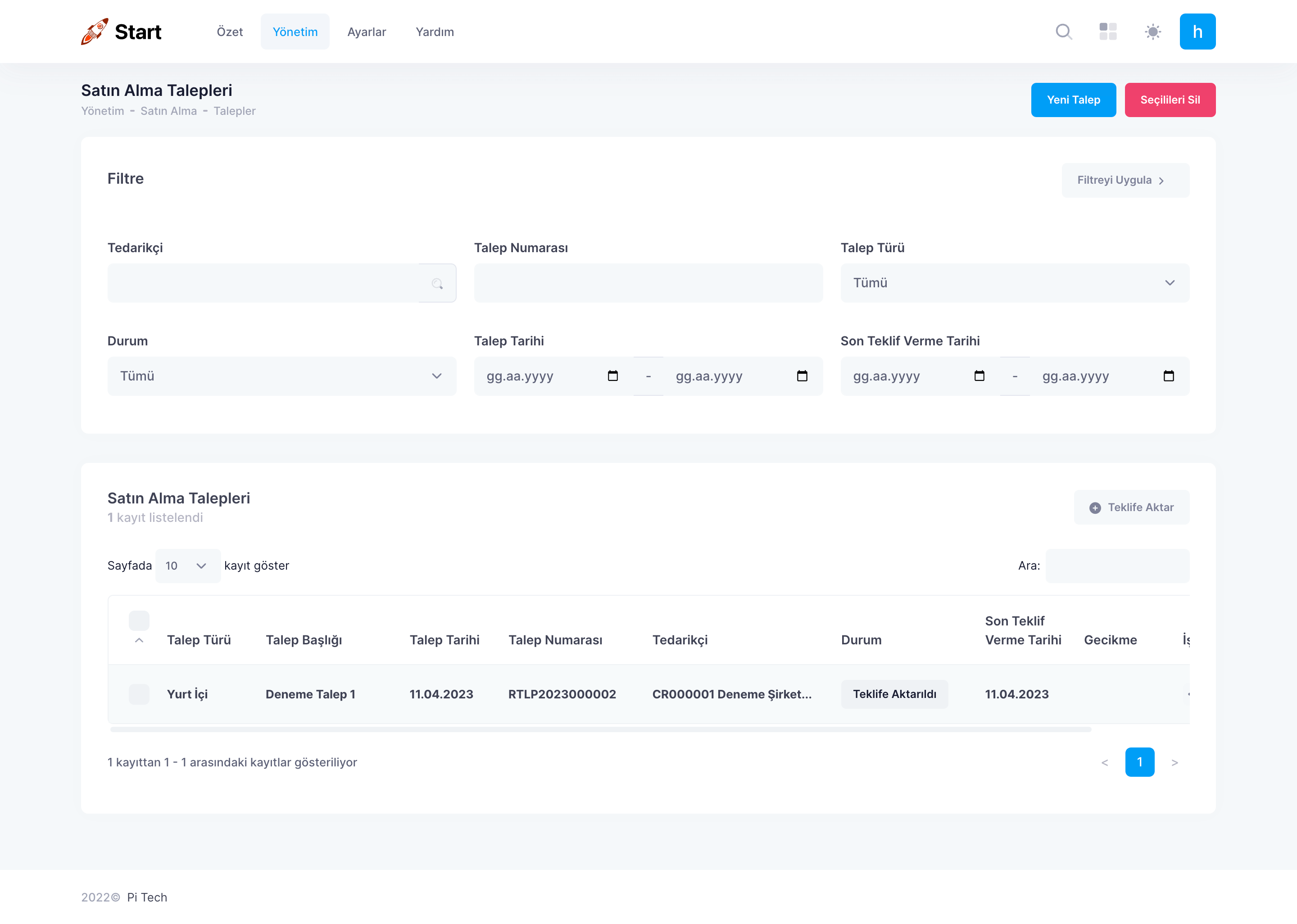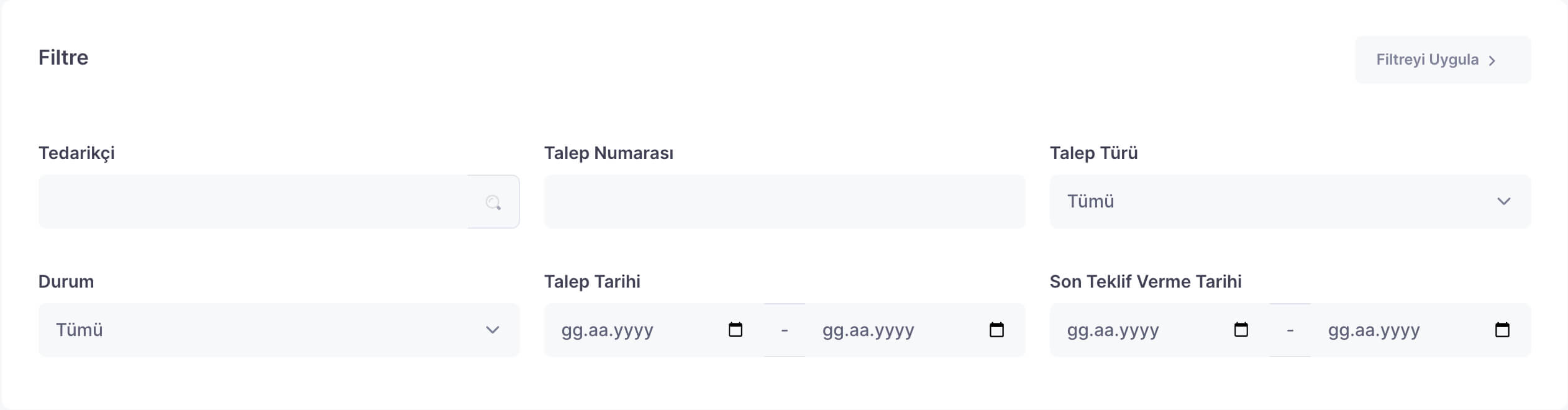 Oluşturalan talepler arasından ilgili kaydı bulmak veya belirli kriterlere göre talepleri filtrelemek için ‘Filtre’ alanını kullanın. Kriterleri belirledikten sonra alanın sağ üst tarafından bulunan ‘Filtreyi Uygula’ya tıklayın.