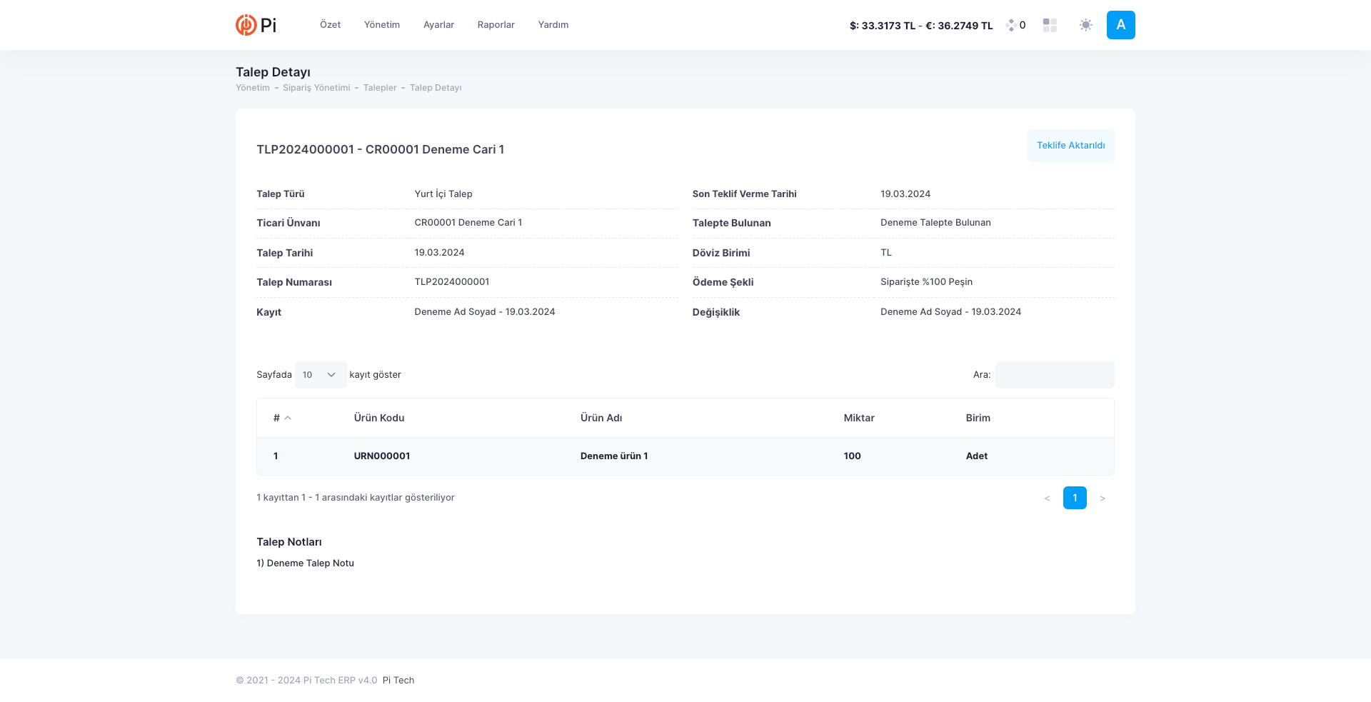Talebe ait detay bilgileri görüntülemek için Menü Çubuğu’nda bulunan Yönetim > Sipariş > Talepler’e tıklayın. Tabloda ilgili talebi bulun. İşlemler sütunu altında bulunan üç noktaya tıklayın. Açılan işlemler menüsünden ‘Detay’a tıklayın.