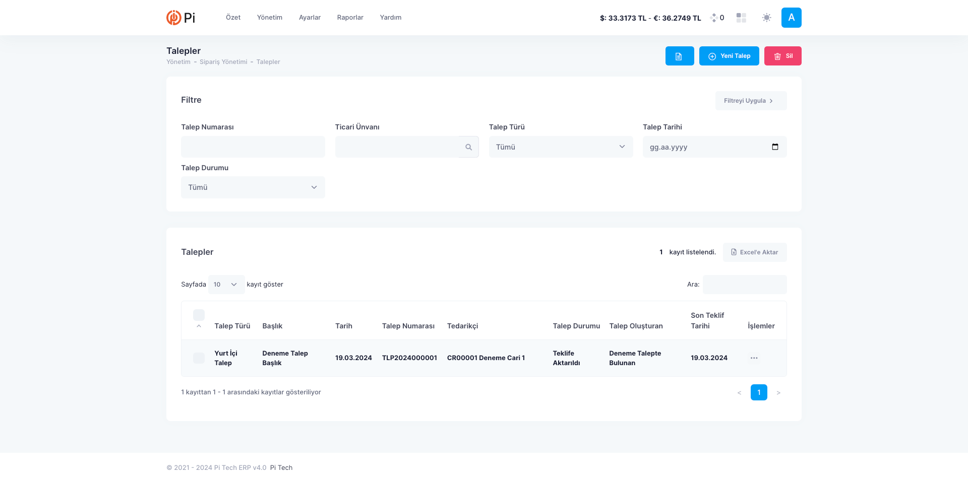 Oluşturulan talebi silmek için Menü Çubuğu’nda bulunan Yönetim > Sipariş > Talepler’e tıklayın. Tabloda ilgili talebi bulun. İşlemler sütunu altında bulunan üç noktaya tıklayın. Açılan işlemler menüsünden ‘Sil’e tıklayın. Gelen uyarıyı onaylayın.