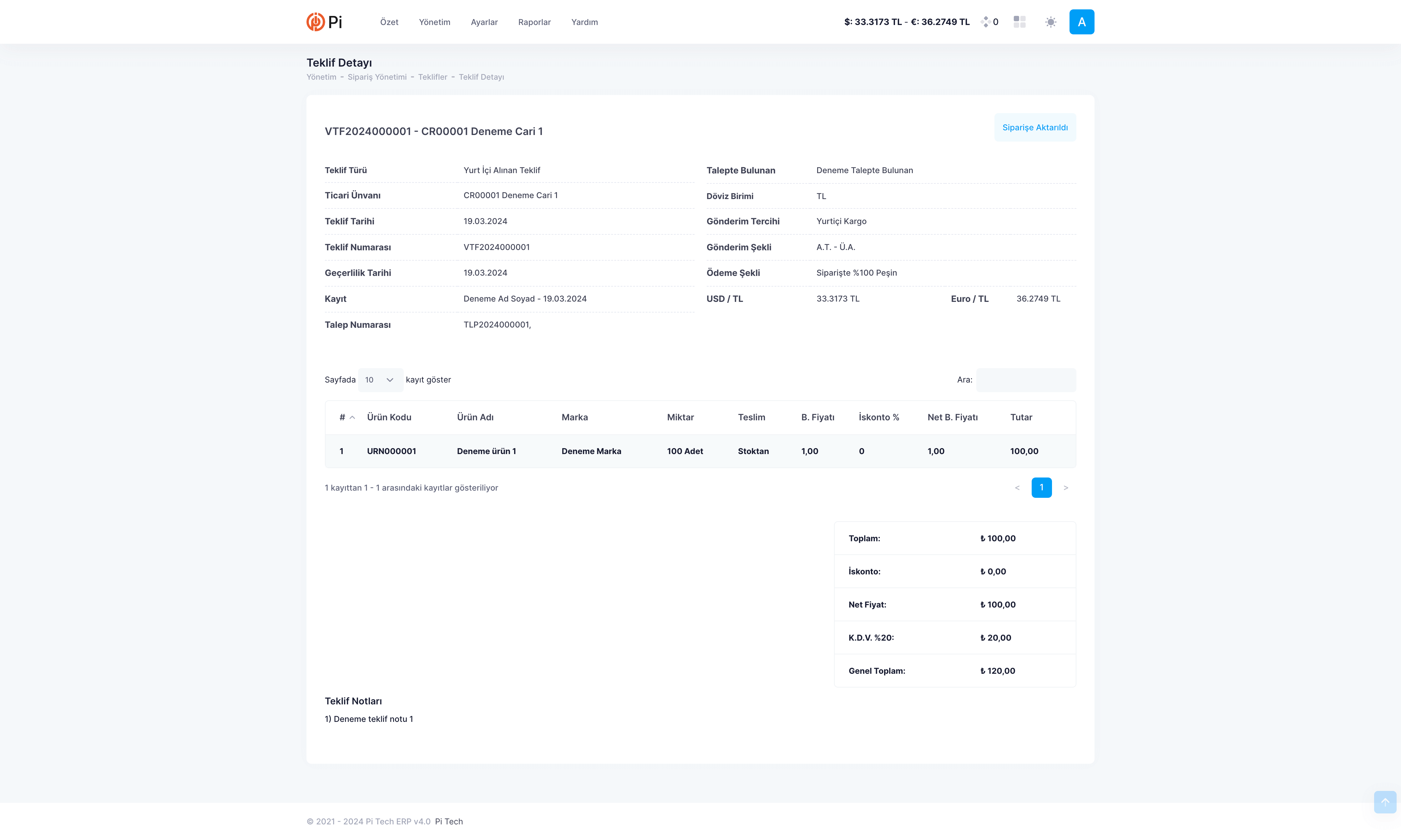 Teklife ait detay bilgileri görüntülemek için Menü Çubuğu’nda bulunan Yönetim > Sipariş > Teklifler’e tıklayın. Tabloda ilgili teklifi bulun. İşlemler sütunu altında bulunan üç noktaya tıklayın. Açılan işlemler menüsünden ‘Detay’a tıklayın.