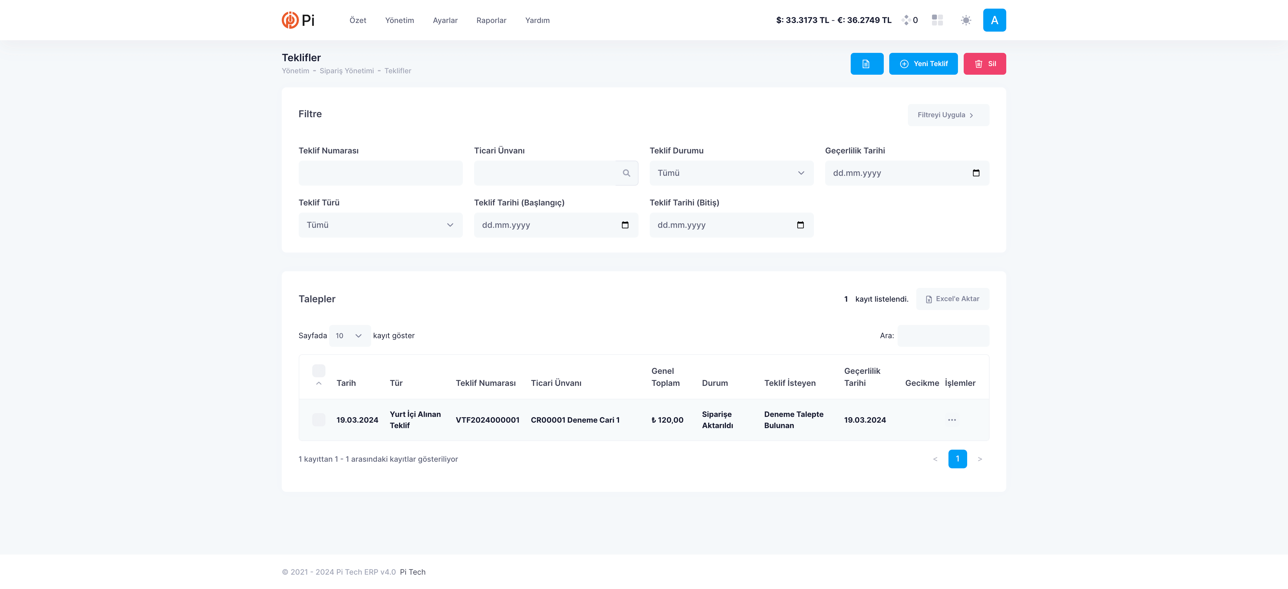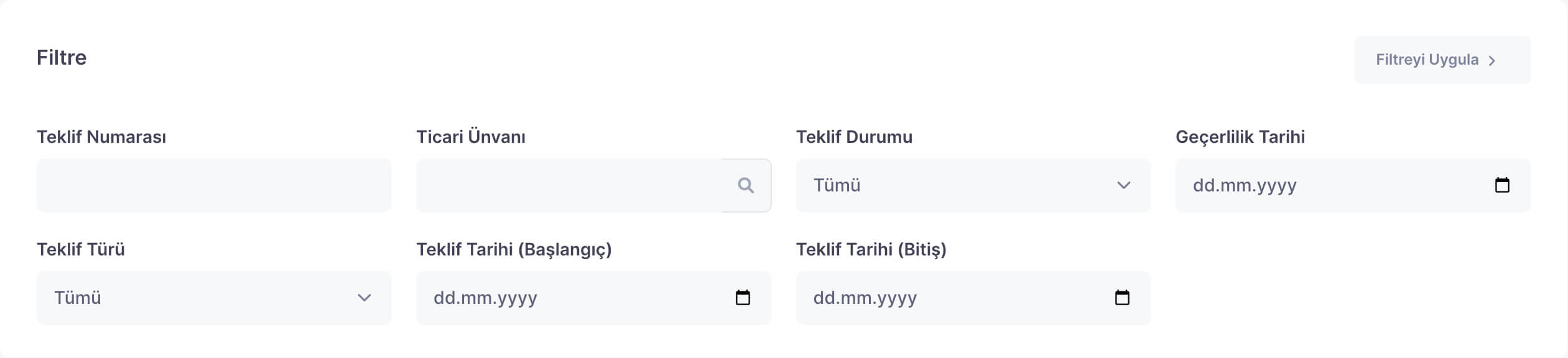 Oluşturalan teklifler arasından ilgili kaydı bulmak veya belirli kriterlere göre teklifleri filtrelemek için ‘Filtre’ alanını kullanın. Kriterleri belirledikten sonra alanın sağ üst tarafından bulunan ‘Filtreyi Uygula’ya tıklayın.