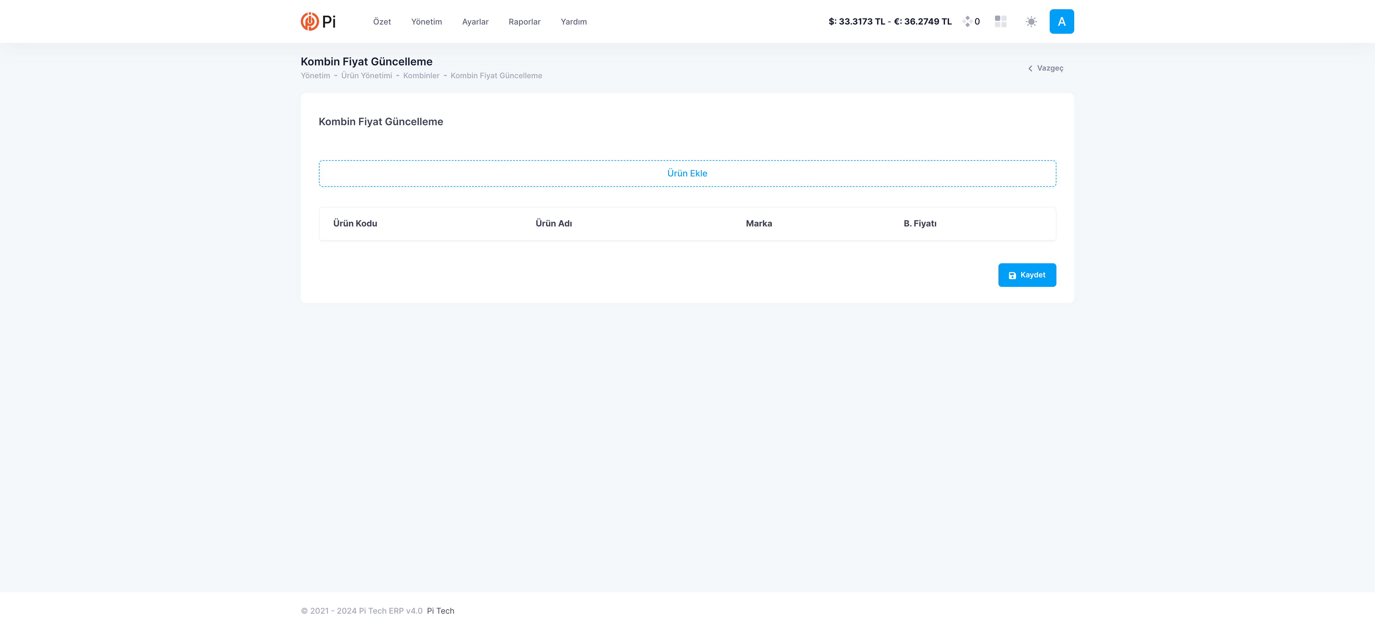 Menü Çubuğu’nda bulunan Yönetim > Ürün > Kombin Fiyat Güncelleme’ye tıklayın.